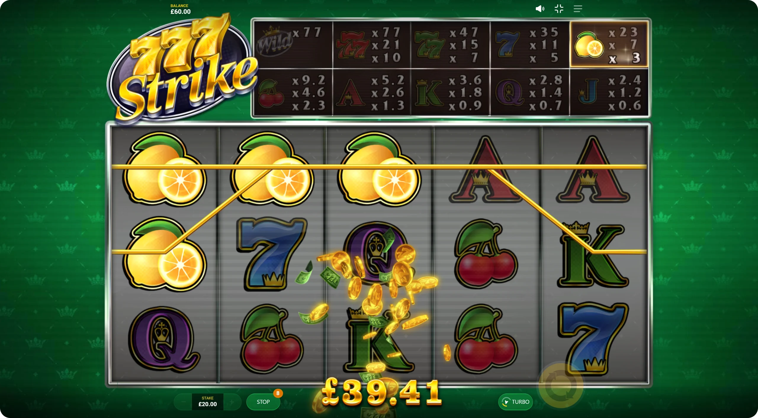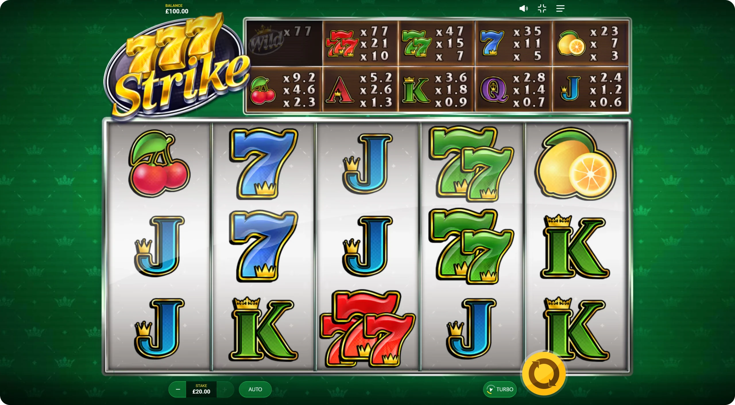 A familiar 5×3 layout with 10 paylines is the most common among modern video slots, and 777 Strike gameplay is quite straightforward as a result. Players can expect fewer wins in this high-volatility title, but the prizes will be substantial when they come.