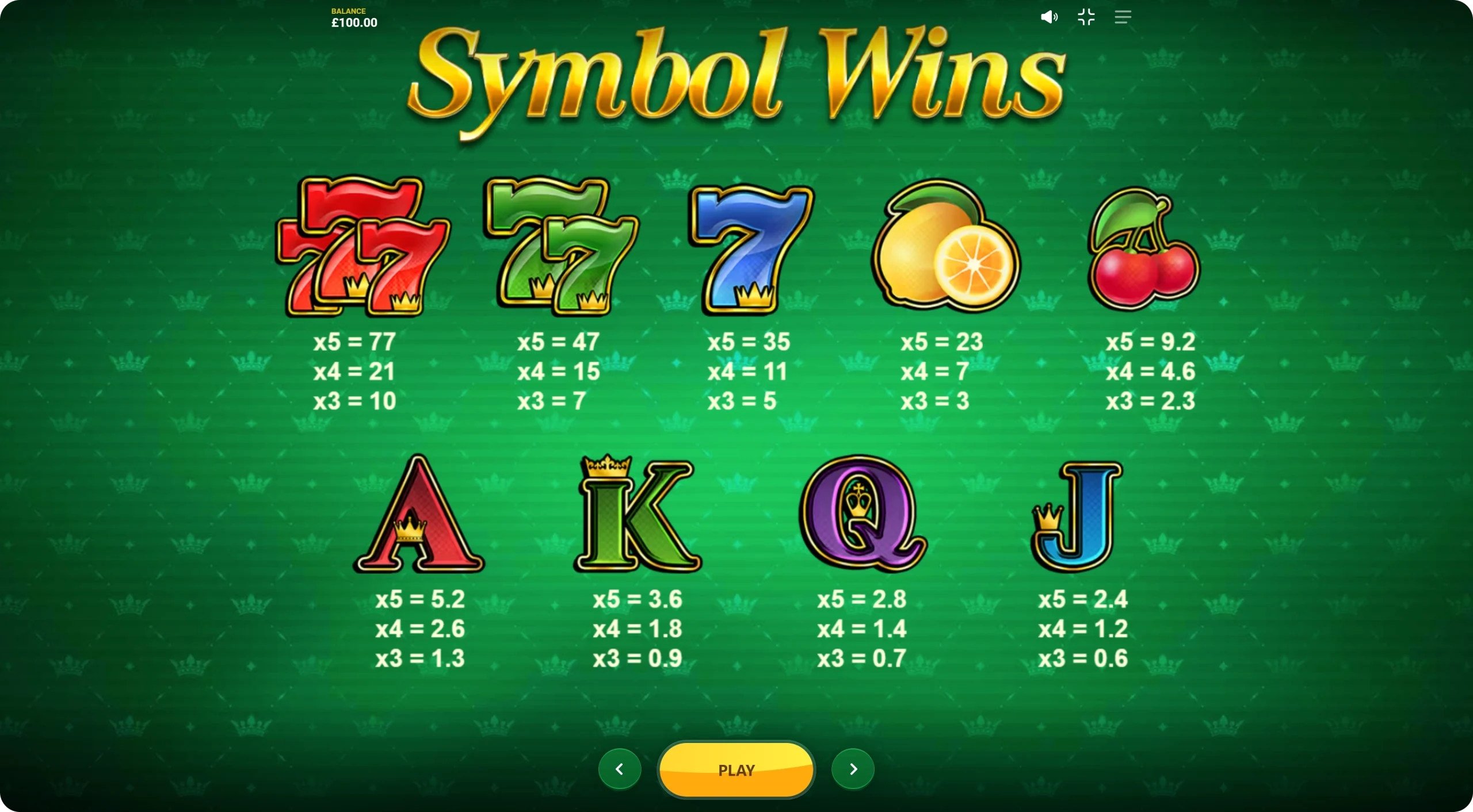 Red, green, and blue Lucky 7 symbols have higher value, while lemons, and cherries are medium-value icons, and playing cards have a lower value. Wild icons substitute all others, and five of them have the same payout as Red 7s, with x77 of the wager.