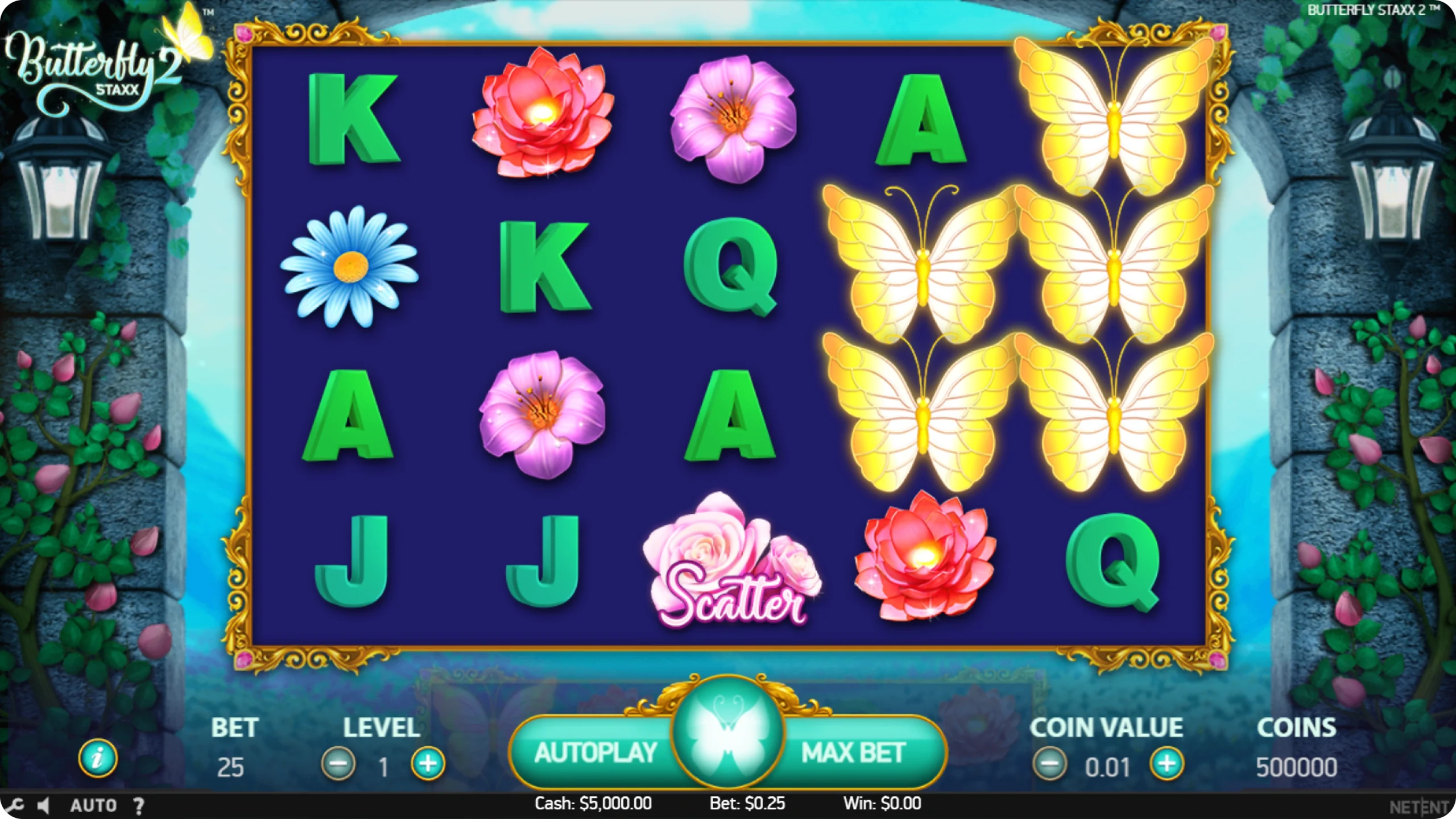 Depending on the number of scatters, players can land between five and seven free plays, which can lead to substantial wins with stacked butterfly icons.
