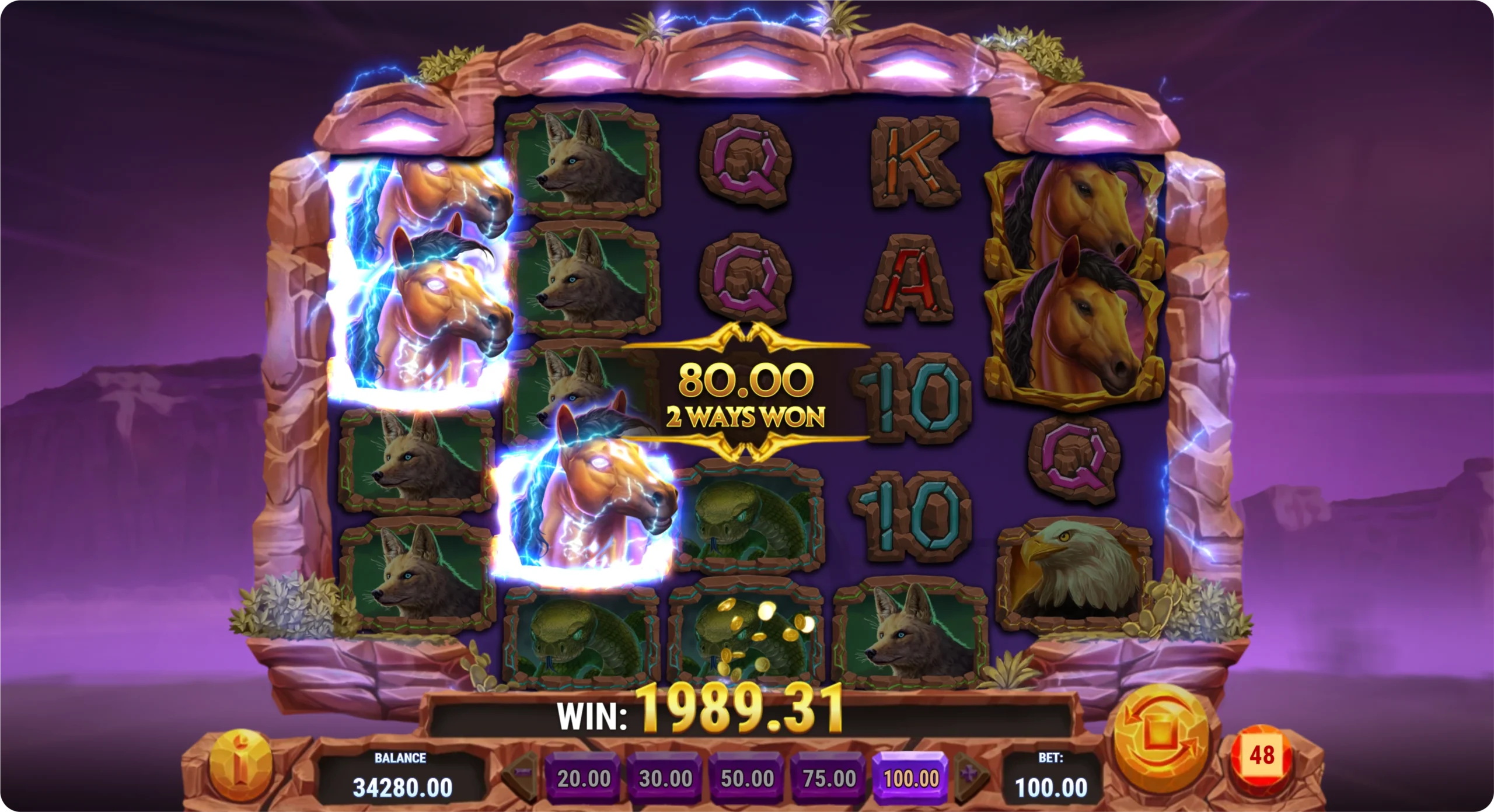 A backdrop of the American desert and colorful irregular layout host animals and playing card symbols in another Play’n Go take on a Wild West setting. The premise behind the game is outlined in its intro animation—a horse is struck by lightning and acquires extraordinary abilities, which form the basis of the animal-themed slot’s features.