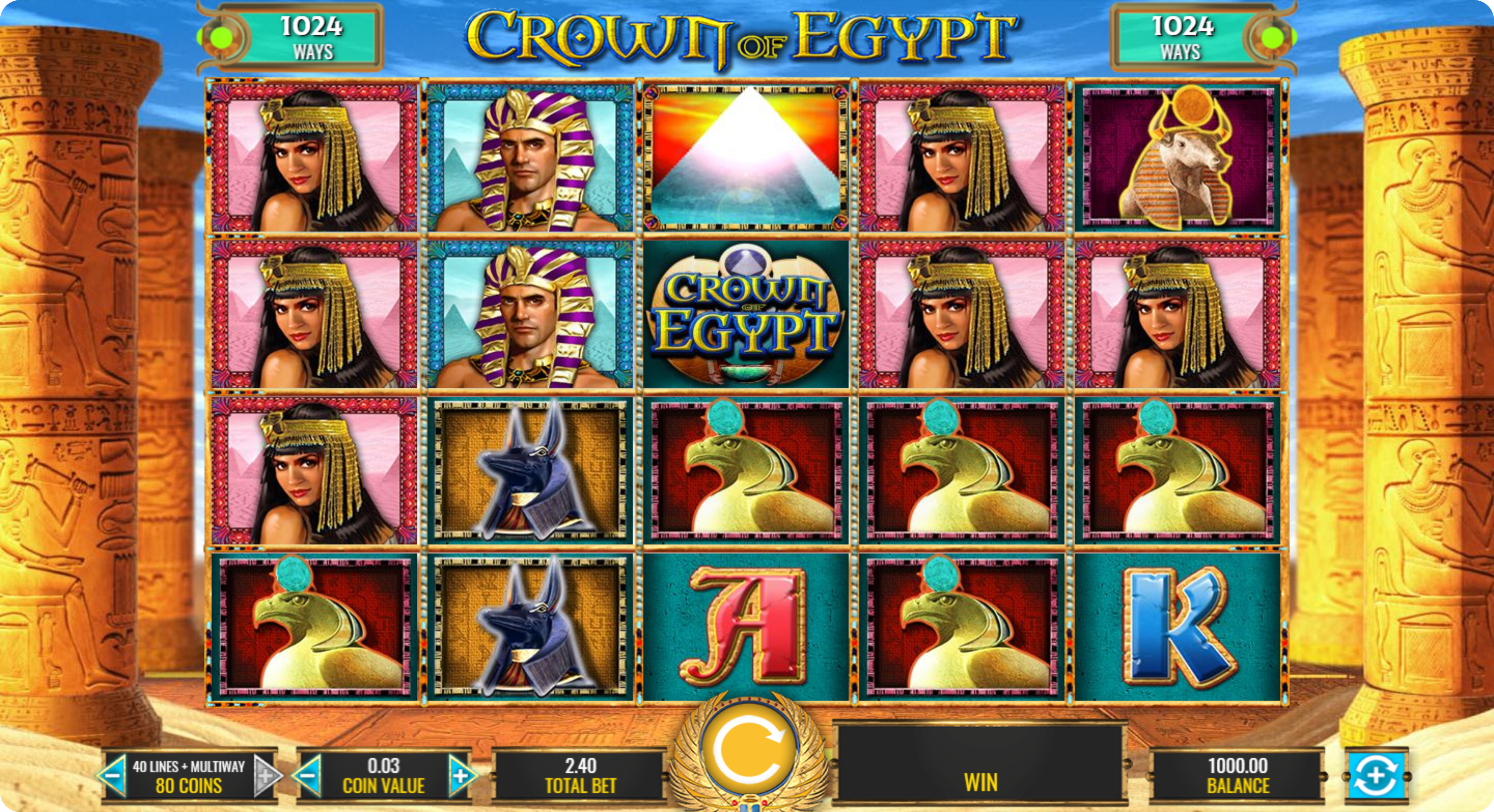 IGT created a believable Ancient Egypt setting with pillars of the temple as a backdrop for a 5×4 grid. The game has 40 fixed paylines where players must land at least three identical symbols from left to right. However, developers made things more interesting by offering 1024 ways to win for adding 40 coins to the bet.