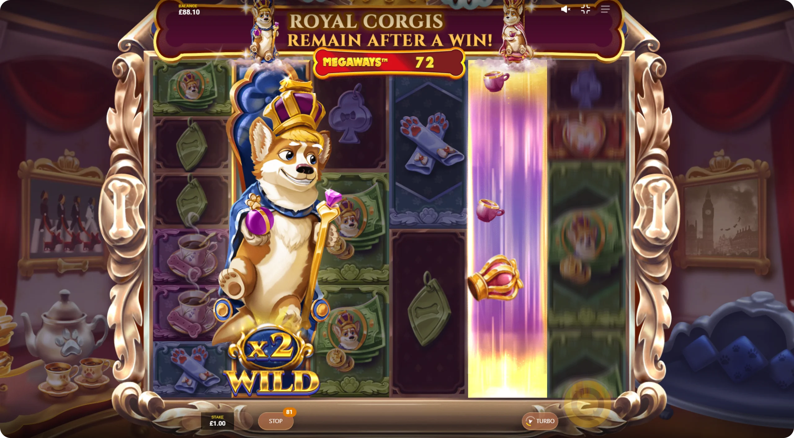 The Crown is the most valuable icon in the game, followed by Hearts, Doggy Money, Teacups, and Gloves. Card suits are lower-value symbols. The game has the royal corgi couple as two separate wild icons, and they extend throughout the entire reel when they land on either the second or fourth reel.