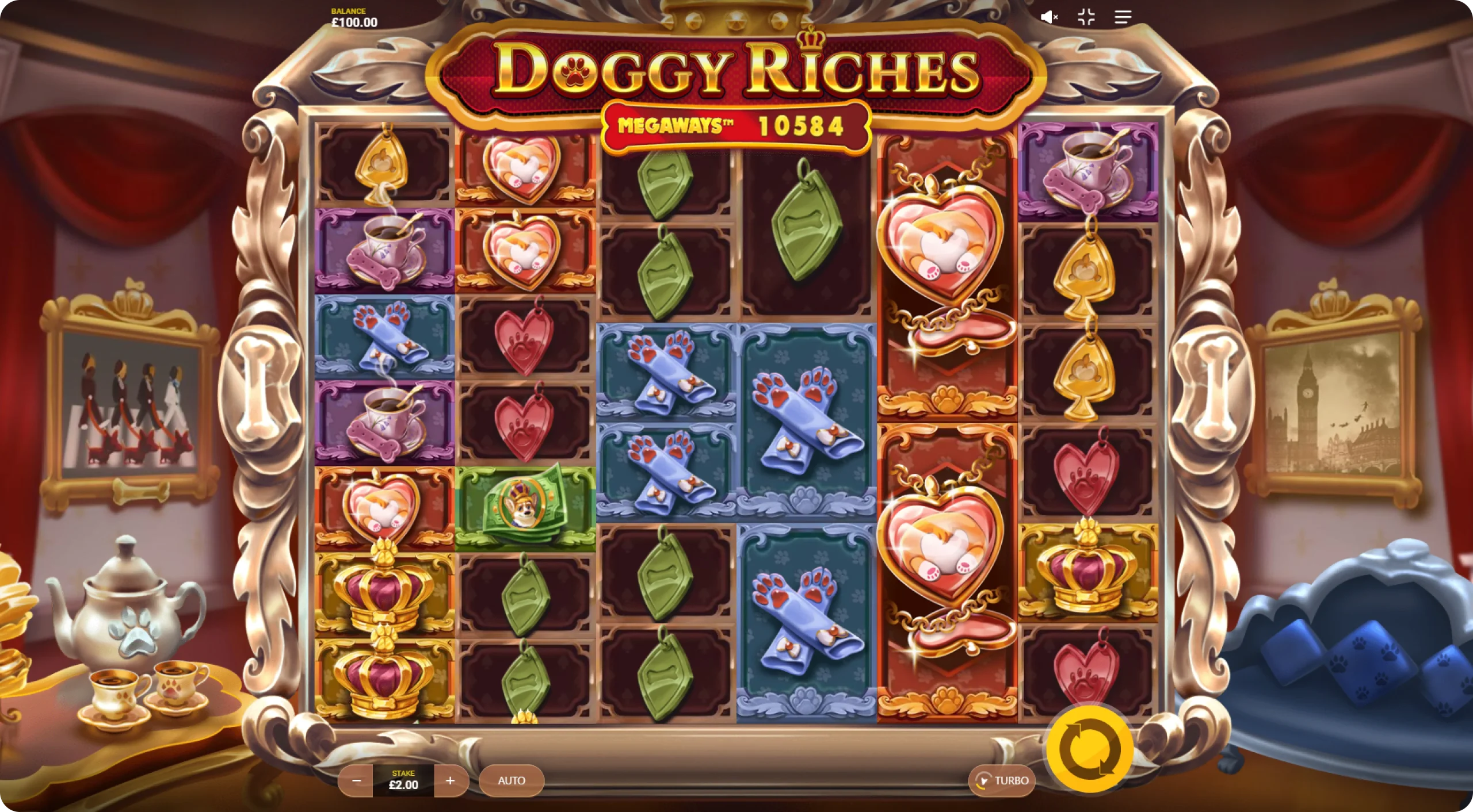 Doggy Riches from Red Tiger introduces a Corgi royal family and a world of expected wealth. The royal manor, filled with details, is the backdrop for an ornamented 6×7 layout. The Megaways mechanics have the usual (but still very large) 117,649 ways to win, and come with cascading reels where winning symbols disappear, opening positions for new ones to fall into their place.