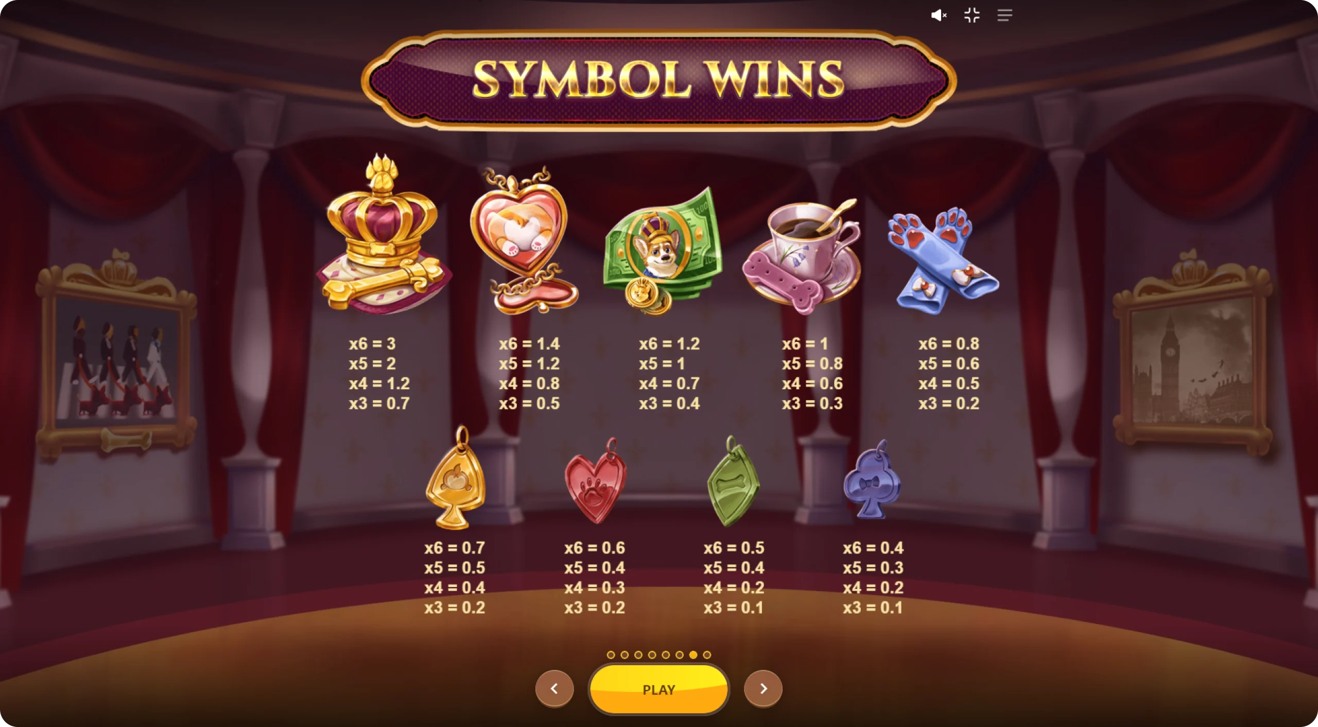 To trigger the bonus, casino visitors must land the royal couple simultaneously. The award is 10 Queen Spins, during which the Royal Corgi super symbols stay locked throughout the entire round, and players can land additional Wild Baby Corgis. Each win in the complimentary round increases the multiplier, allowing for some really big prizes. The biggest possible multiplier is 20x, and it is reset at the end of the Free Spins. Unfortunately, there is no possibility of re-triggering and receiving more plays before the round concludes.