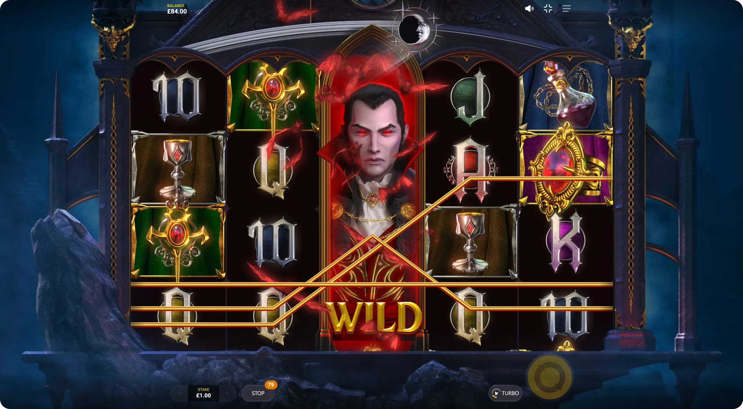 The day lasts 16 spins, while the night goes on for 8, and the Dracula is a wild icon that can appear on any reel randomly during the day. In the cover of the dark, he becomes Super Dracula, covering the entire reel. This symbol also bites Lady icons, turning them into wilder ones.