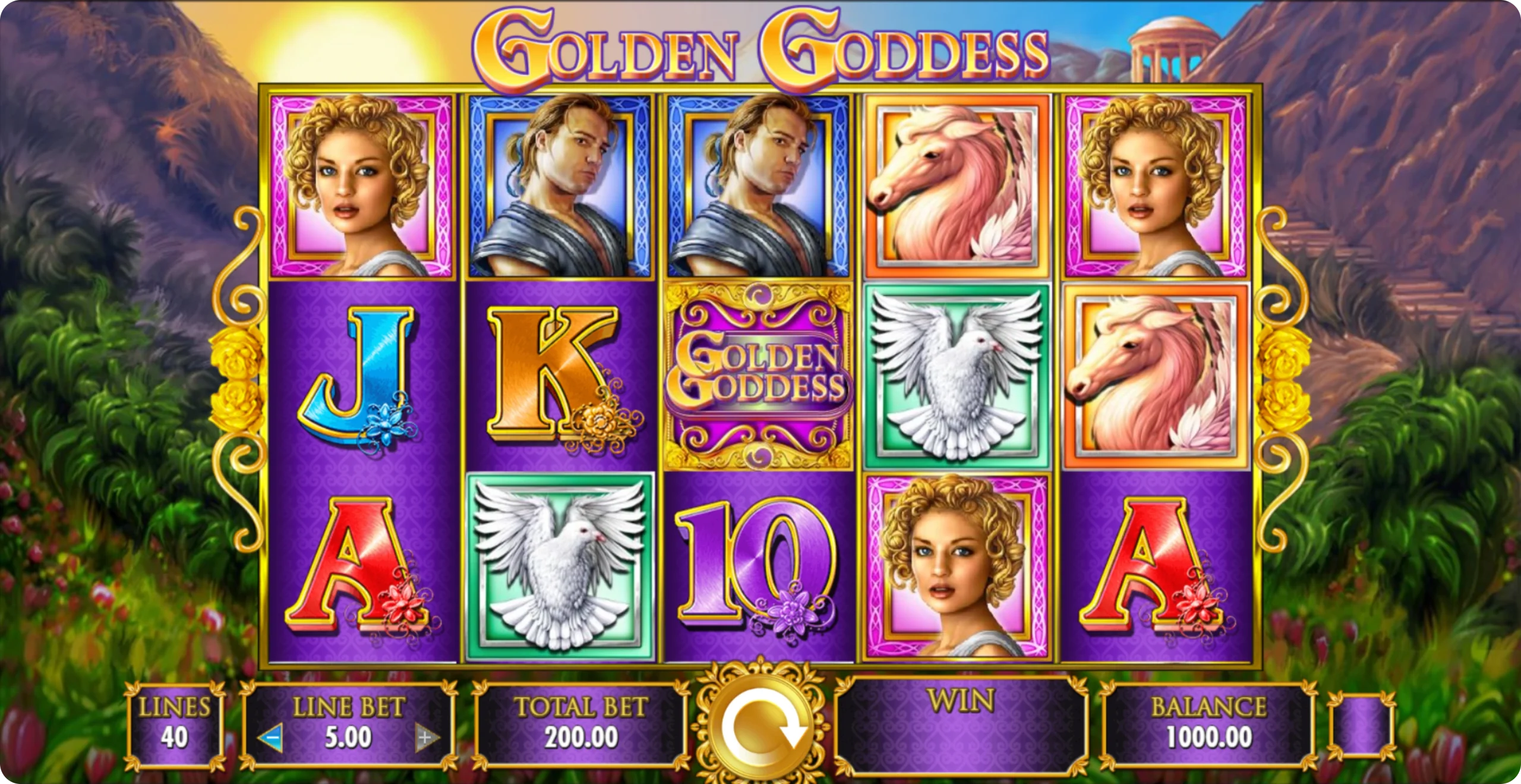 Players will look to land at least two high-paying or three of the other symbols to get a win on the 5×3 layout. With 40 lines paying from left to right, there are plenty of ways to win. The Golden Goddess logo is the highest-paying symbol, allowing a maximum payout of 1000x. It also acts as a wild, along with the rose bonus icon.