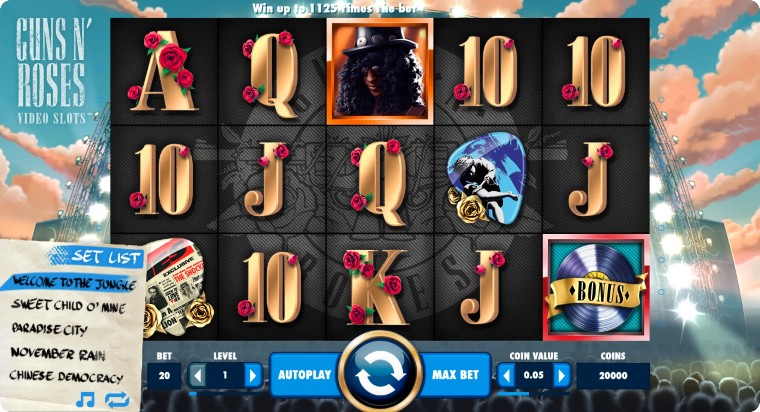 With so many unique additions to gameplay, the Guns N’ Roses slot can hardly become boring. It is a standard five-reel, three-row title with 20 fixed paylines awarded from left to right. With a return to player of 96.98%, this title is comfortably above the average.