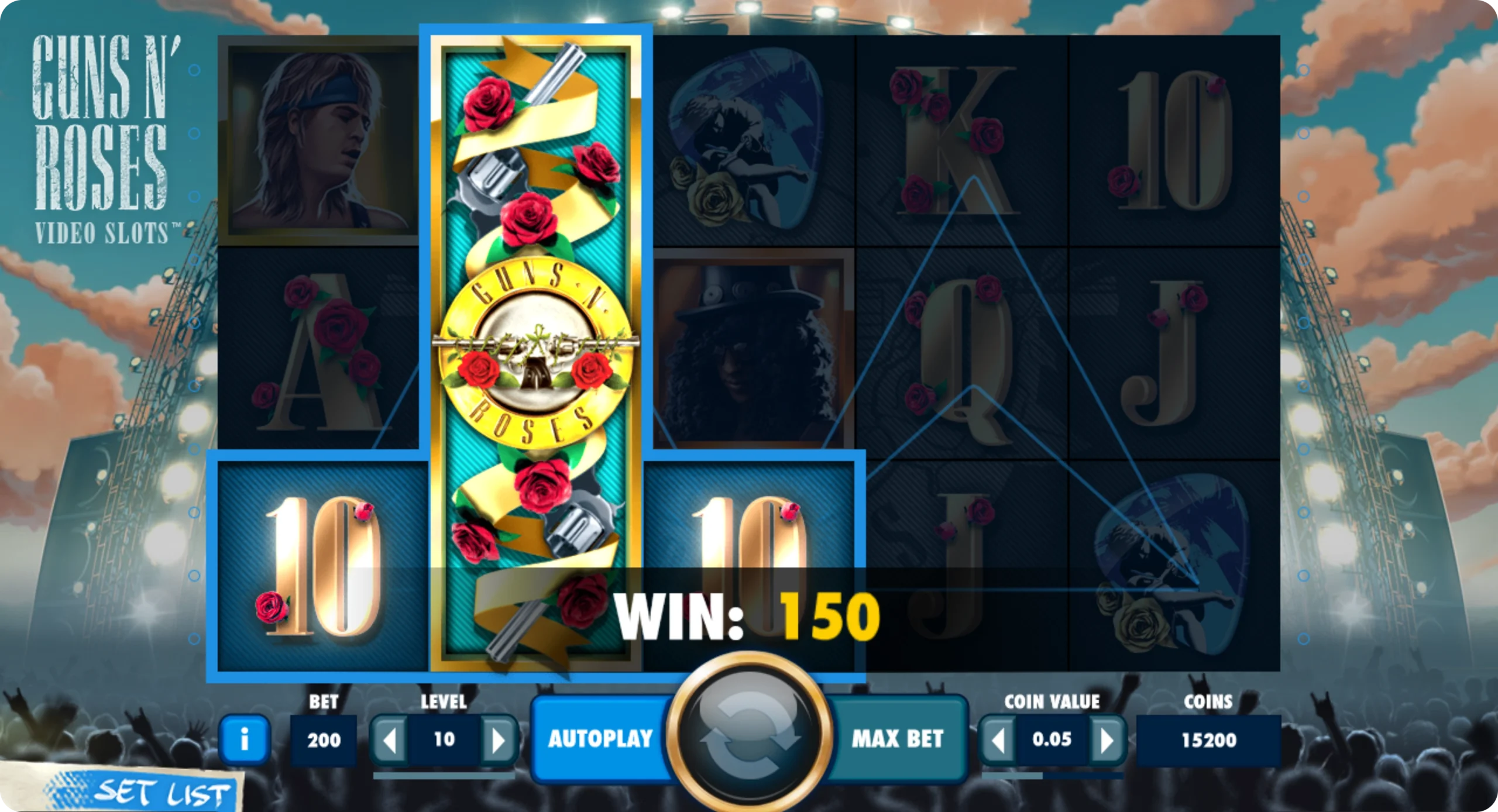 The Encore round starts with animation and an ecstatic crowd rocking to the Paradise City song. Users get ten complimentary plays, and in each spin, a stacked band member takes up one of the columns and acts as a wild.