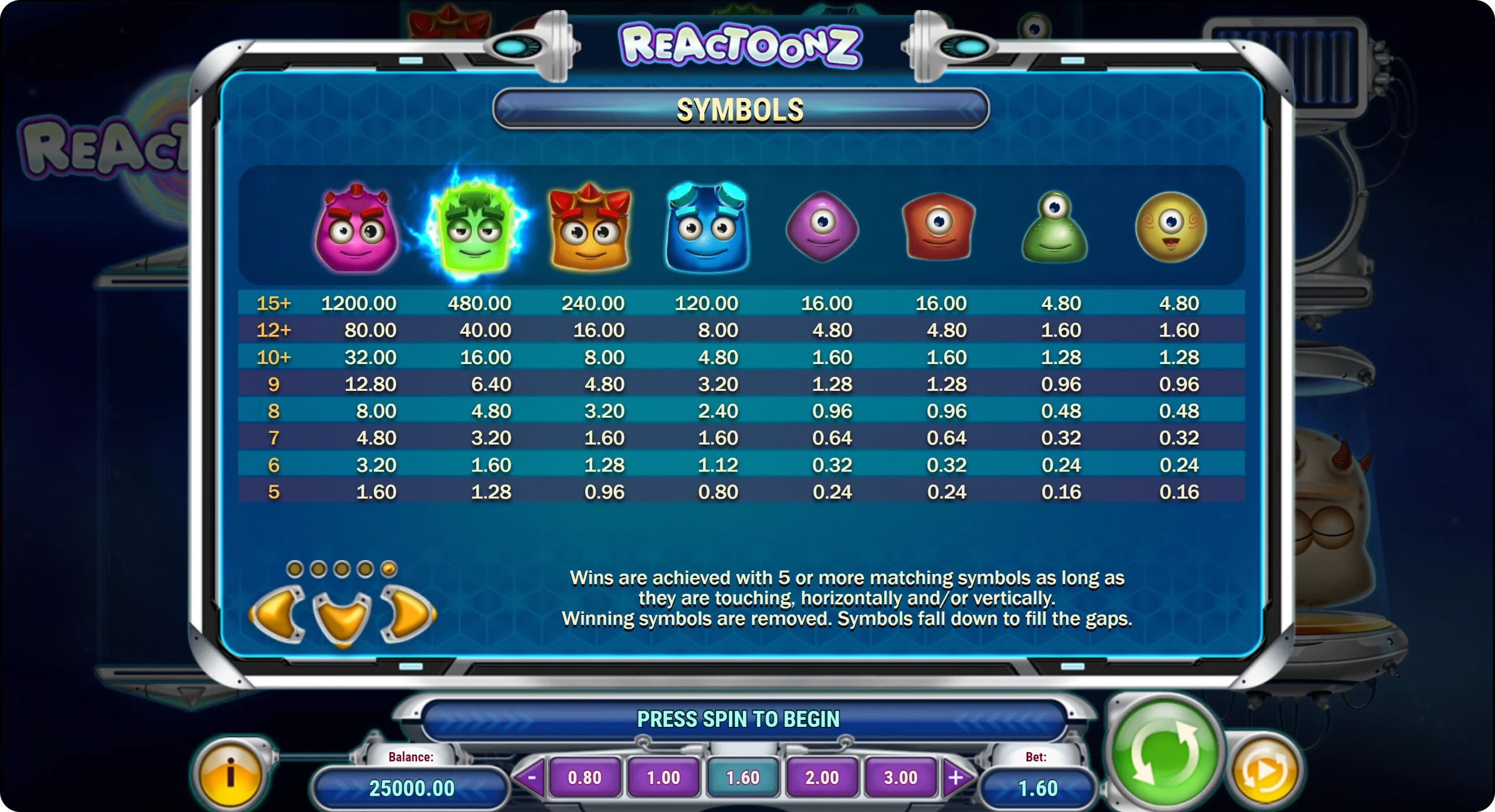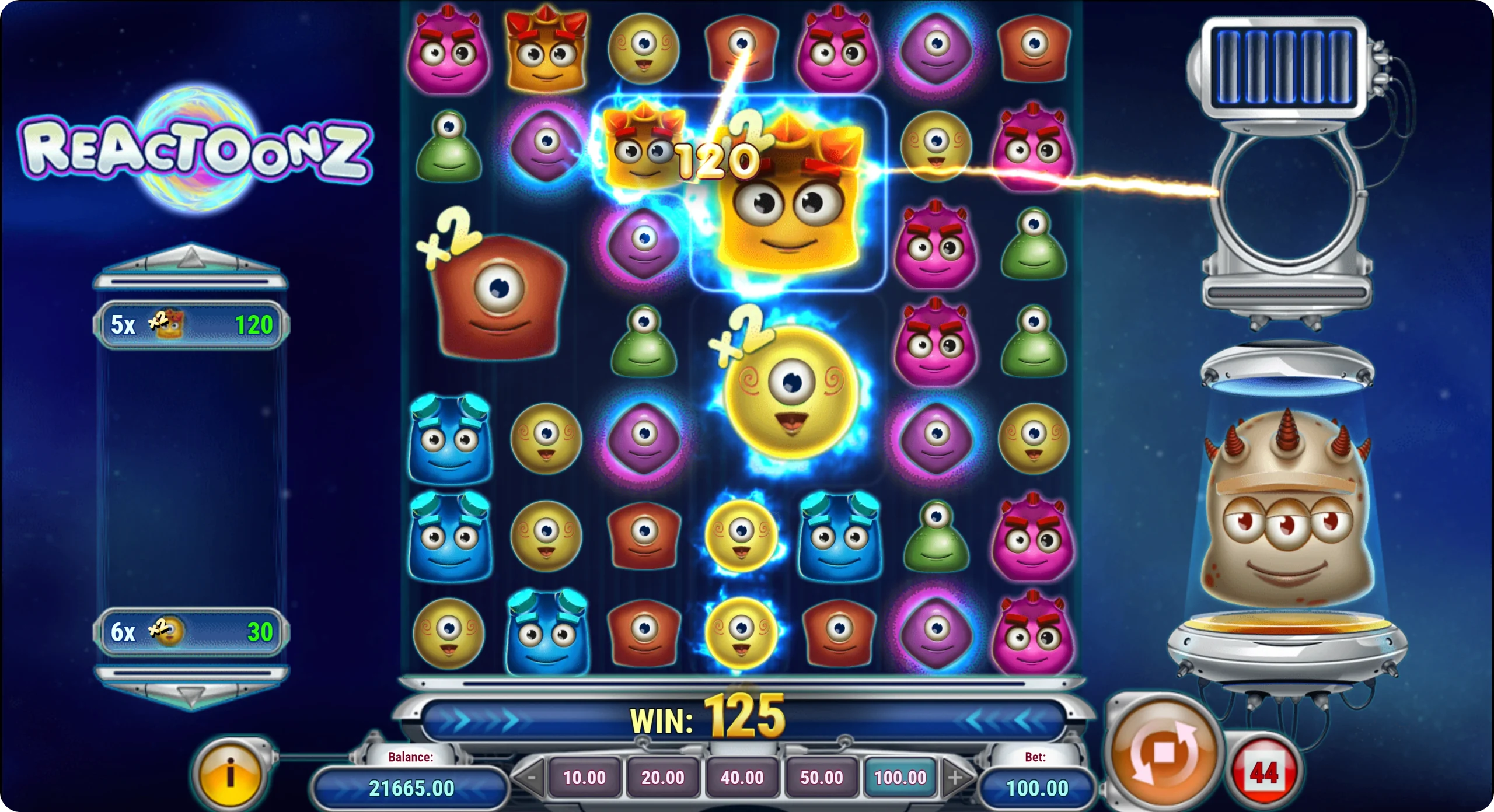While it might look different, the cascading gameplay is familiar to most slot players. The fast pace is complimented by high variance, meaning winning is less frequent, but players might expect a bigger payout when it occurs. Simultaneously, Reactoonz has an above-average return to player of 96.5%, which makes it a great option for long-term play.