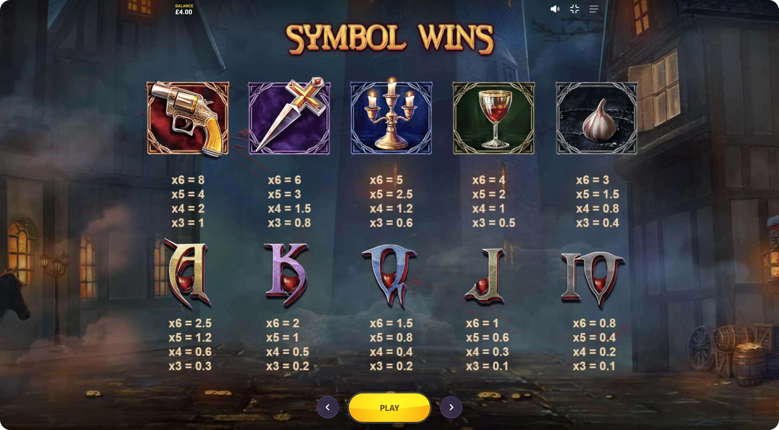 Werewolf scratches create multipliers in the base game. The highest-paying symbol is the revolver, followed by the dagger, candle holder, wine glass, and garlic. Playing cards hold less value.